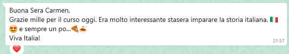 Besonders begeistert haben mich die Hörübungen mit authentischen Stimmen aus Italien und die vielen interaktiven Methoden, die Carmen so herzlich in den Kurs eingebaut hat. Als ich kurz danach Ostern in Italien verbracht habe, konnte ich dank des Kurses alles ganz bewusst genießen – inklusive der ‘colomba di Pasqua’. Und das Highlight: Am Ende durften wir italienische Spezialitäten verkosten. Lernen mit Geschmack, Herz und echtem Mehrwert – einfach empfehlenswert!